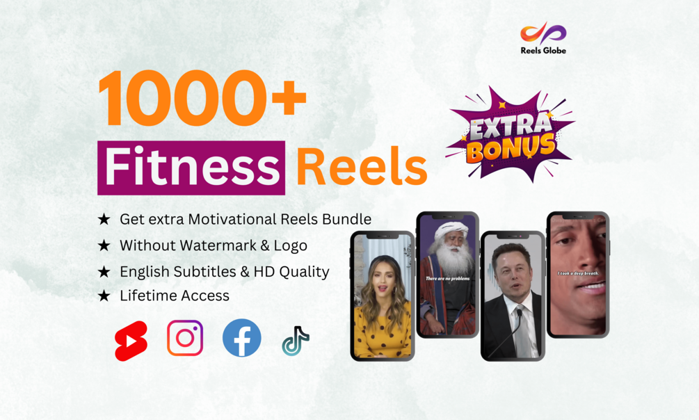 Bundle of 1000 Fitness Reels with English subtitles, and Bonus. All the reels are HD, and copyright free.